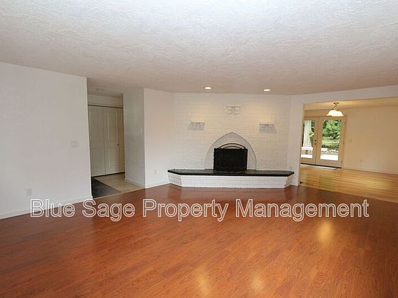 This is a spacious house, centered around a wood fireplace. From the living room you can see the dining room-area, with french doors opening to a fabulous trex deck. Walk down to the family room and 2 car garage. Go up to the 2nd level which has three bedrooms (one is en suite) and two baths. The last staircase takes you to the master bedroom suite with a verdant, woodsy, peaceful view.