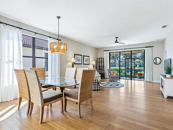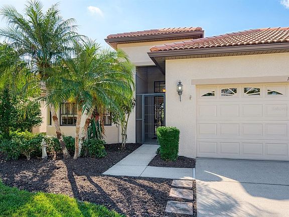 Discover this beautiful 2-bedroom home with a den, 2 full bathrooms, and a 2-car garage, perfectly situated with lake views in the premier 55+ resort-style community of Venetian Falls—just minutes from gorgeous Gulf beaches, shopping, dining, and historic Main Street Venice. You’ll love the open Sorrento floor plan, featuring a light and bright bay-window dinette with views of the front of the home. The kitchen boasts durable Corian countertops, a breakfast bar, 42” cabinets, stainless steel appliances, and a spacious pantry. The primary suite offers peaceful views and a large customized walk-in closet. Its ensuite bathroom includes a generous Roman shower, dual sinks, a private water closet, and a linen closet. The den, guest bedroom, and guest bathroom are located at the front of the home with a separate hallway for added privacy. Enjoy al fresco dining or lounging on the lanai while taking in the lovely views and visiting birds. Additional features include hurricane shutters, screened front entryway, new carpet in the bedrooms and den, and engineered bamboo flooring in the living and dining rooms. This home is move-in-ready with newly cleaned tile floors, cleaned windows, fresh paint in most rooms and freshly painted home exterior. Venetian Falls residents enjoy exceptional amenities such as a heated lap pool, spa, resistance-walking pool, state-of-the-art fitness center, billiard room, bocce, and a clubhouse with a full-time activity director. Onsite management, maintenance-free lawn care, internet, and cable TV are all included in the reasonable HOA fees. Don’t miss the opportunity to make this wonderful home your own!