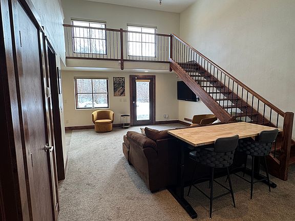 1Bedroom + Private Den with 2 Bathrooms (965sf) and 1 parking space, on the Yampa River overlooking Steamboat Ski Area, with private river access - available immediately. All utilities included. 2nd bathroom features full front loading washer & dryer and utility sink. Downstairs also features a large entry hallway with ski / Bike storage, and coat closet as well. The apartment features a 480sf patio overlooking the Yampa River, and the Steamboat Ski Area. The open kitchen features granite countertops and full stainless appliances, perfect for entertaining and cooking. The adjacent living room has 18' tall ceilings and an opens to the back patio, and an open staircase leading to the bedroom & loft. Bedroom features 3x windows with Hunter Douglas top-up / bottom -down blinds letting in lots of natural light and views of the Yampa river and Ski area.