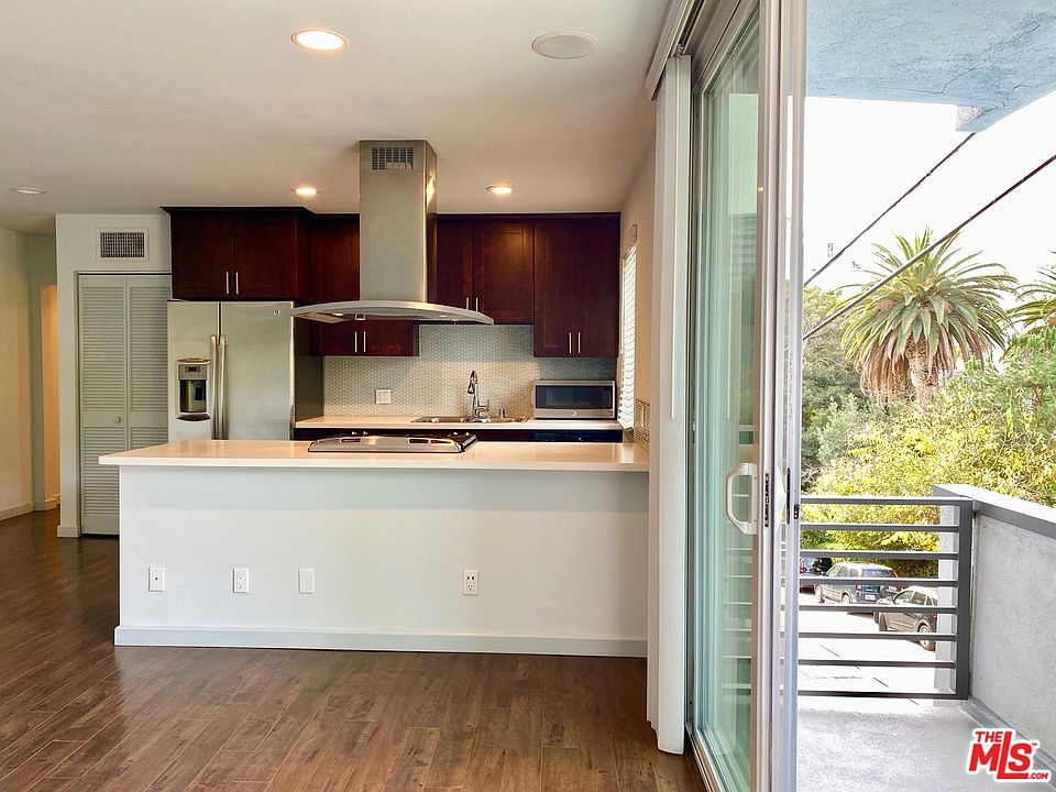 Huge, 2 BR 2 BA unit with tree top views overlooking Hollywood from the spacious living room balcony. Completely renovated with the latest designer details and appliances to include new dark wood floors throughout, custom recessed lighting, frosted glass doors, washer/dryer and central A/C & heat. Cable/internet ready, built in iPhone dock and speaker system and 2 custom outlets for easy wall-mounted flat screen installation. Gorgeous center island in a kitchen that is light & bright and offers dark wood wrap cabinets, Cesar stone counters, custom tile splash guard, brand new stainless steel appliances and a ceiling mounted hood over the gas range. Community amenities include a swimming pool, intercom access, and controlled-access parking. The property is landscaped with mature trees and topiaries. Located across the street from a members-only dog park. Within walking distance to Runyon Canyon. 2 covered parking spaces are included.