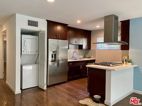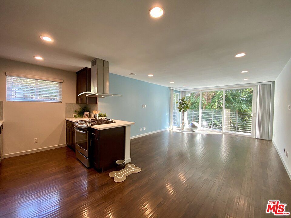 **1 Month Move-in Special** Amazing first floor corner 1 BR/1 BA unit. HUGE floor-to-ceiling windows opening on to a very large wrap-around balcony overlooking the pool and offering a gorgeous view of Hollywood. Completely renovated with the latest designer features and appliances, including new dark wood floors, custom recessed lighting, frosted glass doors, in-unit washer/dryer and central A/C & heat. Cable/internet ready, built-in iPhone dock and speaker system and 2 custom outlets for easy wall-mounted flat screen installation. Gorgeous center island in kitchen, which is light & bright and offers dark wood wrap cabinets, Caesar stone counters, custom tile splash guard, brand new stainless steel appliances and a ceiling-mounted hood over the gas range. Community amenities include a swimming pool, intercom access and controlled-access parking. All the quiet of the canyon while just steps from Hollywood & Highland! Across the street from a small private (members only) dog park.