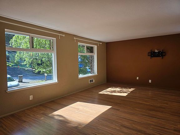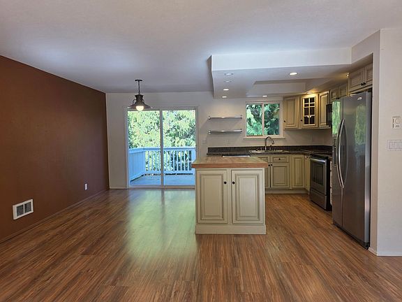3 plus bedroom home in Poulsbo's Edgewater Estates. Split level floor plan. Upstairs features open living, dining and kitchen with sliding door to balcony with stairs that lead to fenced backyard. Two bedrooms. Primary bedroom with 2nd door to main floor bathroom.