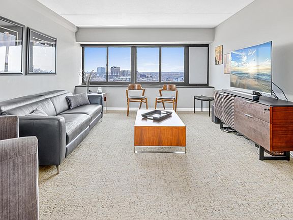 Enjoy the best view in town from this dramatically updated and coveted 19th floor unit. Open plan living with informal dining room, custom-built ins, fantastic kitchen with newer appliances, contemporary cabinets and granite counter tops. Master bedroom features ample closet space and ensuite bath with walk in shower natural stone floor and tiles. This unit has been remodeled wonderfully! Community living at Riverview Towers is comprehensive; monthly fees include all utilities, basic cable, heated indoor pool, whirlpool workout room and sauna, large outdoor patio with gas grills, community room w/kitchen, package room, prof management. Tucked away, but steps to the U, Downtown & anywhere you need to go.