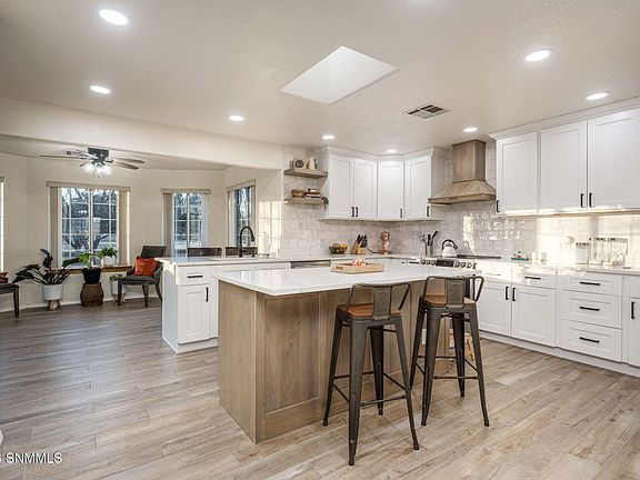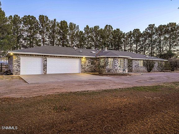 Located in the desirable North Valley of Las Cruces on Trails End Rd, this recently updated home sits on 2.08 acres with horses allowed, beautiful mountain views and pecan trees. Offering 2,345 sq ft, the home features 3 bedrooms, 2.5 bathrooms, a flex room or office, and a 3 car garage.The heart of the home is an upgraded dream kitchen, filled with natural light and designed with quartz countertops, a large island, ample counter space, an eating area, and stainless steel appliances. Wood look tile flooring runs throughout the home, creating a clean and cohesive feel.All bathrooms have been remodeled with tile, new cabinetry, and quartz countertops. The 3 car garage has been thoughtfully upgraded with insulated garage doors, a finished office or flex space, a mini split system, and barn wood accents, making it ideal for a workspace, gym, or hobby area.Additionally, this property has pecan trees, an irrigation well, EBID, and ground water rights. Enjoy serene country living with room to spread out