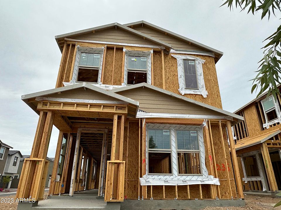 Tree-lined streets, pedestrian-friendly sidewalks and a 5,500 sf recreation center with resort style pool an kiddie pool, shaded ramadas, parks, gathering areas, pickleball courts and basketball. Close to I-10, 101 and 303. Walking distance to restaurants, movies, entertainment and shopping. Fantastic end lot location with larger side yard! Craftsman style exterior, with pavered entry and pathway. Gas stub and gates at side yard for convenience. Enlarged, glass enclosed walk-in shower at primary bathroom, with linen closet. Gourmet style kitchen, including stainless steel dishwasher, gas cooktop, under cabinet hood, and built in microwave and oven. Shaker style cabinets painted white and silver gray, with several extras including executive height vanities, boxed in refrigerator, and more.