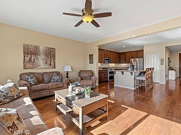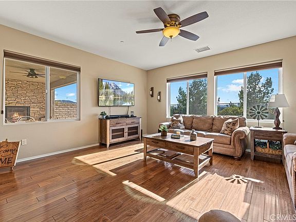 Don’t miss the breathtaking VIEWS from this stunning Plum Canyon home! Nestled at the top of the community, this home showcases an open and inviting floor plan with a full bedroom + full bathroom on the main level—ideal for guests or multi-generational living. The beautifully designed kitchen features rich cabinetry, granite countertops, stainless steel appliances, recessed lighting, plus a spacious island with seating. It seamlessly flows into the bright and airy family room, where large windows frame picturesque backyard views! Dining area opens to a covered patio through sliding glass doors, creating the perfect indoor-outdoor living space. Upstairs, the primary suite is a serene retreat with a walk-in closet and an ensuite bathroom featuring dual vanities, plus a soaking tub with separate shower. Three additional bedrooms are well sized with closet space, while a spacious loft provides extra versatility. A dedicated laundry room adds convenience upstairs. Step outside to a private backyard oasis with a covered patio, stacked stone fireplace, and ceiling fan—perfect for relaxing or entertaining. The low-maintenance, drought-friendly hardscape offers plenty of room to customize, with space to add a pool or create your dream outdoor escape! NO Mello-Roos! This is an opportunity you won’t want to miss!