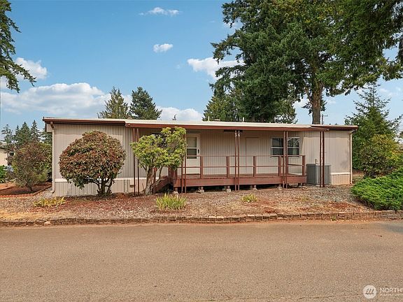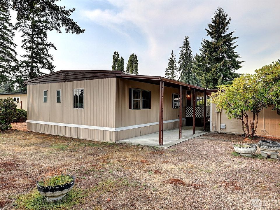 Great opportunity to own this affordable home in the all-ages Coach Country Corral community! This spacious 3 bed, 2 bath home offers a functional layout w/a blend of vintage charm and thoughtful updates over the years. Recent improvements include freshly painted beds & baths, new carpet in primary suite, & a newly painted exterior. Enjoy a newly built back porch with peek-a-boo views of Mount Rainier, giving the home a peaceful countryside feel while still being close to shops, restaurants, & JBLM. Additional highlights include covered carport, spacious insulated storage shed, central heating & A/C, w/generous front & back yards. Plenty of room to entertain & enjoy the outdoors. Water and septic included with space rent.