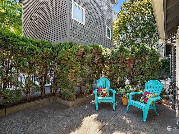 Exceptional Madison Park location just 1/2 block to restaurants, coffee shops, bakery, grocery, hardware store, park with playground and tennis courts, and 2 beaches! No need to leave the neighborhood! Charming, well-maintained, 8-unit complex. Spacious patio by private entry. Up one flight to great room with cozy gas fireplace, sunny kitchen, powder room, west-facing balcony. Top floor sports two primary bedrooms, each with its own bath. New carpet and vinyl plank flooring; fresh interior paint. 2-car garage (shared with neighbor) provides one garage space plus an additional alley parking space for guests. Easy commute to downtown, UW, Broadmoor Golf Club, and the Seattle Tennis Club. Active neighborhood association. Come join the fun!
