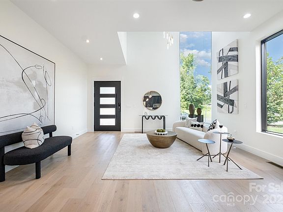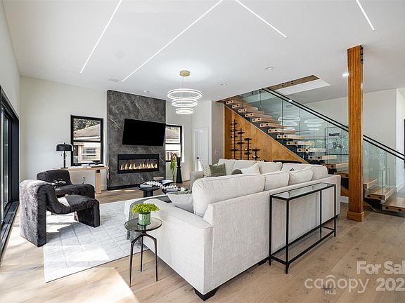 Experience modern luxury in this stunning 3,622 SF home designed with soaring open spaces and walls of windows that fill every room with natural light. The dramatic entry features a chandelier above a 20+ ft ceiling, while 10+ ft ceilings continue throughout the main level for an open, airy feel. A striking 18-ft corner window adds architectural drama and enhances the home's sleek design. The living area is anchored by sleek floating wood stairs with glass railing, and custom lighting.