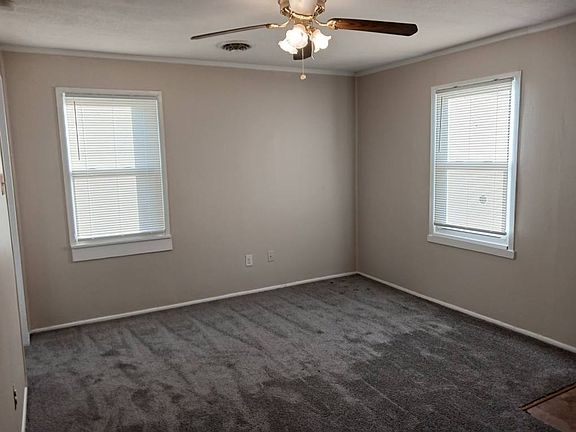 AVAILABLE NOW Cute and cozy 2-bedroom home with brand new paint and carpet throughout. This home features an inviting eat-in kitchen with appliances included. The dryer is located in the attached shed off the kitchen, and there are two shedsone equipped with electricity, perfect for a workshop. The front yard is secured with a chain-link fence, while the backyard offers privacy with a full fence. A removable ramp at the entrance provides convenient accessibility.