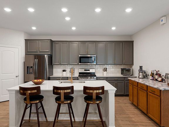 Welcome to this stunning modern cottage in the highly sought-after Mockingbird Park community of Leander, TX. Beautifully maintained 4-bedroom, 2.5-bath home with a first-floor bonus room and spacious second-floor loft - there's plenty of room for everyone to spread out. Make your way inside to discover an open-concept floor plan with soaring ceilings, wood-grain tile flooring, recessed lighting, and designer finishes throughout. The heart of the home is a kitchen built for entertaining, featuring a large center island with bar seating, quartz countertops, stainless steel appliances with gas cooking, and a spacious pantry. The kitchen flows seamlessly into the family and dining areas, creating an ideal space for gatherings. The dedicated office off the main living area provides a quiet retreat for work-from-home needs, while a convenient half bath adds guest-friendly functionality on the main floor. Upstairs, enjoy a versatile second living area perfect for a game room, media space, or lounge. The expansive primary suite features dual vanities, a soaking tub, a generous walk-in closet, and access to a peaceful private balcony where you can relax and take in the breeze. Three additional bedrooms and a well-appointed full bath with dual sinks offer space and comfort for family or guests. Curb appeal shines with native stone accents, a covered front porch, and masonry flower beds. Out back, enjoy a fully fenced yard with a covered rear patio. Additional highlights include a two-car garage, extended driveway, and excellent community amenities. Located in the heart of Leander, this home offers laid-back living with everyday convenience—close to top-rated schools, community trails, green spaces, and just a short drive to the Balcones Canyonlands National Wildlife Refuge. This Mockingbird Park gem is everything you’ve been looking for!