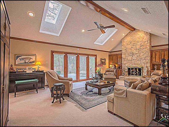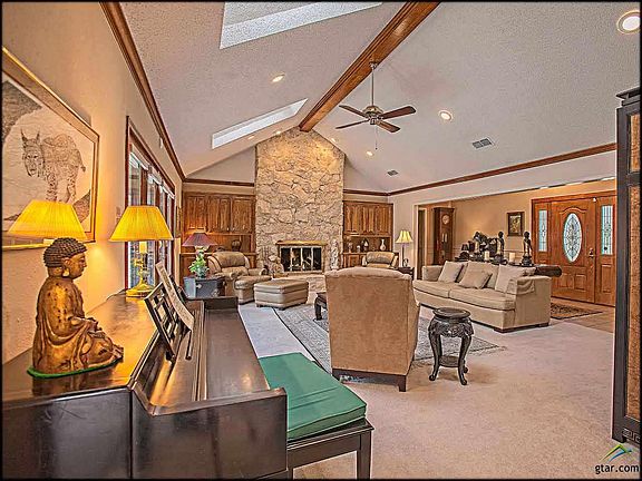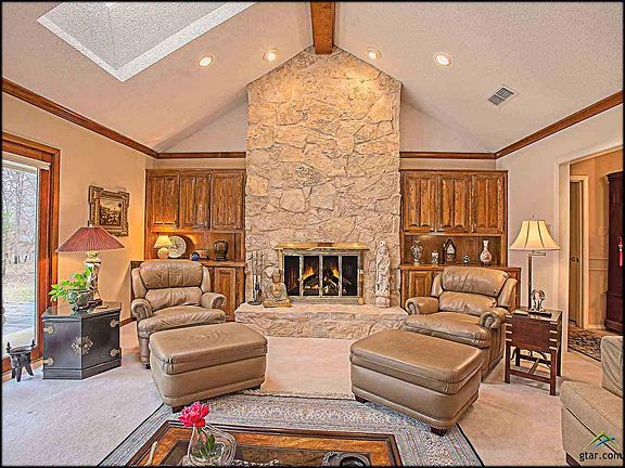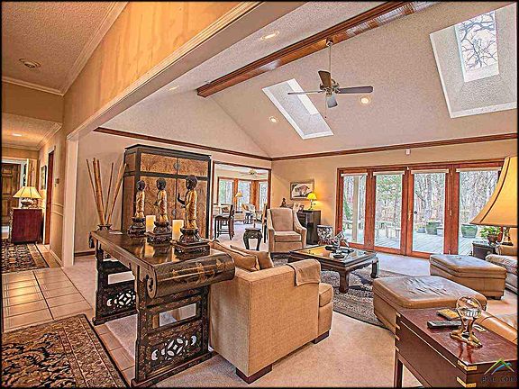 Beautiful Custom Home on 2 Acres in Country Place, Tyler. Lovely one owner home has spacious rooms & wooded views from every room. Inviting front porch beckons you & your guests inside. Stately stone fireplace & hearth have flanking custom cabinets with library shelves. A wall of windows offer inspiring nature views from the rear of the home. Vaulted ceiling & skylight bring natural light into the living space. Cozy den off kitchen could be breakfast area, if desired. Great kitchen has updated stainless appliances, breakfast bar seating, stained custom cabinets with wonderful work space & storage. Formal dining room perfect size for special occasions. Over-sized Master Suite has sitting area with plantation shutters, built in storage cabinets & exit to rear deck. Master bath has separate dressing areas, 2 walk-in closets, large soaking tub and shower. Two guest bedrooms share hall guest bath. Utility room has extra fridge & desk. 3 car garage & workshop! Whitehouse ISD, HOA $220/yr.