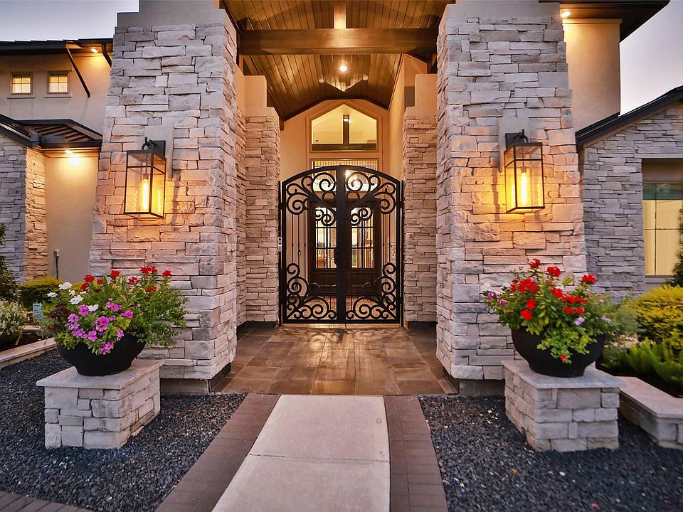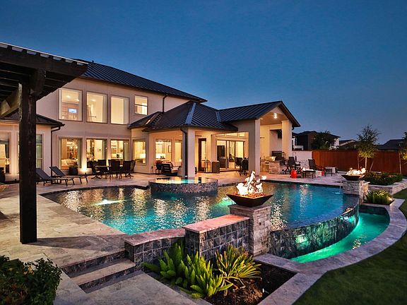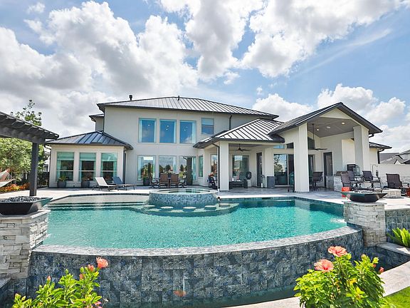 Sparkling poolOutdoor kitchenModern luxuryOpen-concept floor planWalls of windowsExpansive patioRaised spa