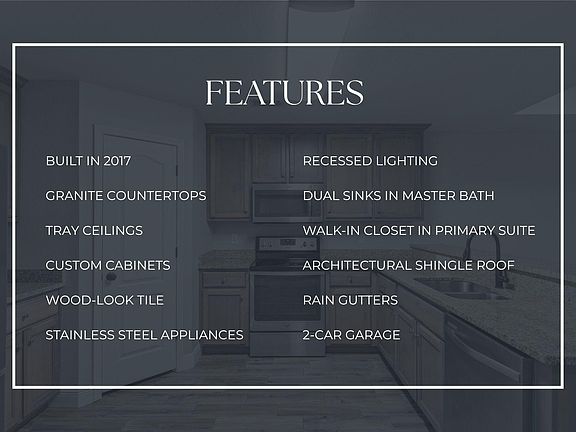 Two lakesGranite countertopsWood-look tileUnderground utilitiesArchitectural shinglesTray ceilingRecessed lighting