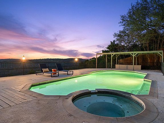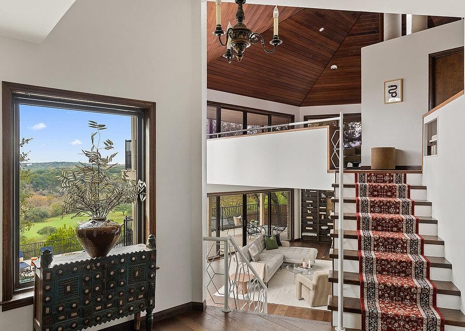 Enjoy sweeping Hill Country views from this iconic Mid-Century architectural gem, located in the coveted Lost Creek neighborhood. Perched above the 16th hole of the Westlake Country Club, this thoughtfully designed residence spans three levels, offering a harmonious balance of openness and privacy. The main level features the primary suite along with a secondary bedroom, while the lower level includes two additional bedrooms, a cozy living space, and a second fireplace—ideal for guests or multigenerational living. Upstairs, the living and dining areas capture panoramic views that stretch for miles with gorgeous teak ceilings. This space highlights a striking mid-century–inspired architectural design, anchored by a dramatic vaulted ceiling lined with rich teak wood that adds warmth, depth, and impressive craftsmanship to the home. Sunlight washes across the original parquet wood floors, revealing their intricate geometric pattern and timeless character. Large sliding doors and picture windows frame the surrounding landscape, while pristine white walls create a balanced backdrop for modern furnishings. Multiple decks across the home create seamless indoor-outdoor living, offering endless opportunities to enjoy sunsets, quiet mornings, or gatherings with friends. The private backyard pool adds another layer of relaxation and recreation, complete with abundant lounge spaces and a fence surround. Situated on a full acre that extends down to the Westlake Country Club, the property offers a rare combination of privacy, scenery, and architectural character. With award-winning Eanes ISD schools and some of the most breathtaking views in all of Lost Creek, this home is truly one-of-a-kind.