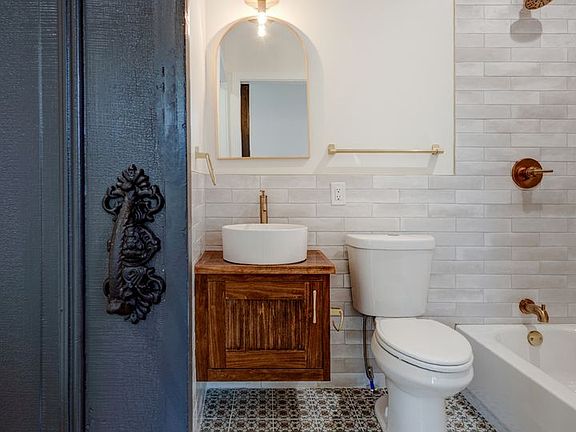 The bathrooms are a true oasis, boasting a chic subway-tiled shower with a glass enclosure and luxurious matte black hardware. A modern vessel sink set atop a rustic wood vanity completes the stylish, modern farmhouse aesthetic.