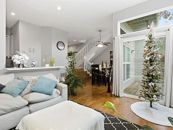 Enjoy relaxed, maintenance-free living in this bright and airy end-unit condo overlooking Lake Monroe. Featuring 2 bedrooms and 2 full baths across 1,087 sq ft, this two-story home offers an open layout filled with natural light, vaulted ceilings, and peaceful views from two private balconies. The main level welcomes you with warm wood flooring, a cozy fireplace, and large windows framing tree-lined views. The kitchen and dining area flow seamlessly together, perfect for casual entertaining. Upstairs, the spacious primary suite offers an en suite bath and private balcony—your own quiet retreat with a glimpse of the lake. Additional highlights include an attached garage, newer carpet, ample storage, and low-maintenance exterior siding. Residents of The Pointe enjoy easy access to Lake Monroe, walking trails, and nearby dining and recreation options. Whether you’re seeking a year-round residence or a weekend escape, this condo combines comfort, convenience, and scenic charm.