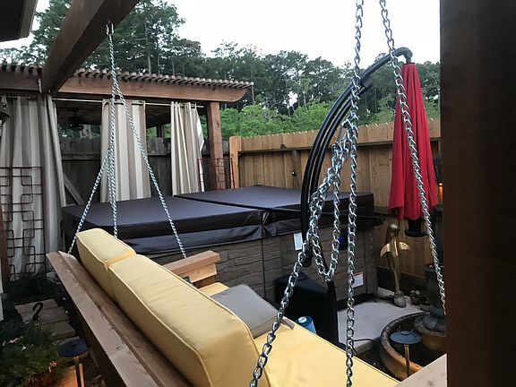 Grana stone backyard entry way new cedar fence pergola with swing daybed cedar Michael Phelps lx 900 spa freshly painted inside and outside
