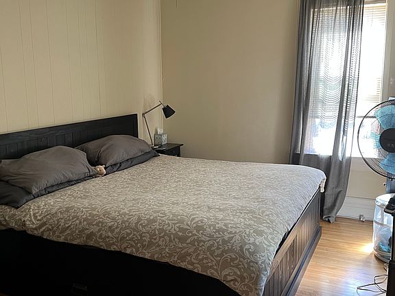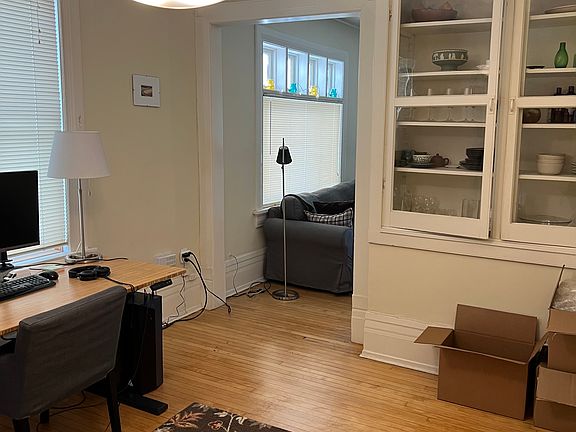 Upper duplex includes 2 off street parking spaces. Eat in kitchen counter, gas stove and refrigerator included. Hardwood floors through out. Sun porch, new windows, ceiling fans in 5 rooms. Besides the living room and dining room there is a parlor w antique fireplace. Washer and dryer in basement. Gas electric and water not included. New bathroom