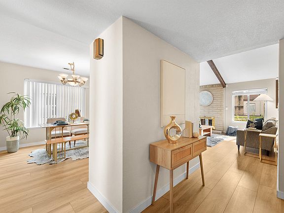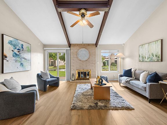 Imagine belonging to your own golf course within walking distance! This spacious 2 bedroom, 2 bath home is nestled in a quiet HOA and features a private gated courtyard entrance, picturesque common area waterway/fountain viewable from the living room and primary room, and vaulted ceilings with a fireplace in the living room. Both bedrooms boast walk-in closets, and there's a 2-car attached garage. The dining room, great room, and hallways feature waterproof laminate flooring installed in 2023, while the bedrooms are carpeted. The kitchen and inside laundry areas have tile flooring, and there's a must-see walk-in pantry! The exterior of the complex was recently painted, and the Venetian Village HOA maintains the roofing and immediate surrounding common areas. Additionally, the Master Association, called Venetian Gardens, offers amenities such as a pool, 9-hole golf course, and pickleball and tennis courts, all included in the annual dues.