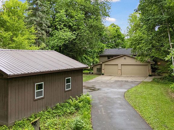 private views of Goose Lake. A 3-car attached garage is complemented by a detached 2-car garage/workshop (24x24), and an additional parking pad with a turnaround offers convenience for guests or extra vehicles. Whether you're watching the sunrise over the water, relaxing by the fire, or enjoying the sounds of nature, this property offers the ultimate in seclusion & comfort while located just minutes from the Arbor Lakes Shopping Center & Rush Creek Golf Course. Don't miss this rare opportunity!
