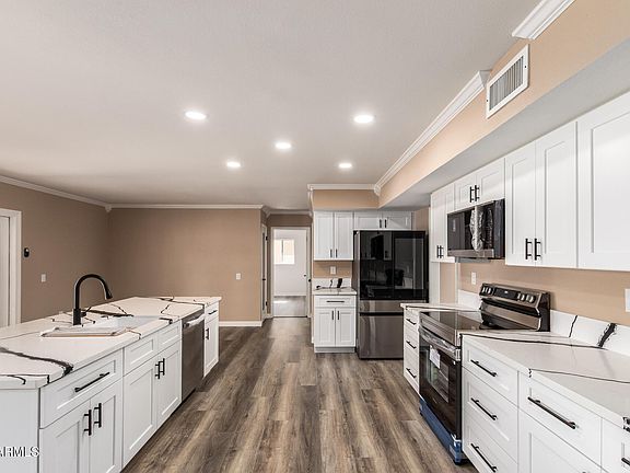 BEAUTIFULLY home, no HOA in the 55+ Sun City! Sits on a golf course lot, it offers 2 beds, 2 baths, 2-car garage, & a low-care landscape. The front porch is just the beginning! The inviting interior showcases tons of natural light, a neutral palette, layered crown molding, and wood-look flooring w/plush carpet in bedrooms. You'll love the formal living room and a desirable great room paired with French doors to the back! The renewed kitchen boasts SS appliances, quartz counters, white shaker cabinetry, a huge island w/breakfast bar, and a dry bar w/wine cooler & rack. The main bedroom has a walk-in closet. Both bathrooms have been upgraded. Large laundry room with a sink & cabinets. Enjoy the tranquil golf course views right from the covered patio of your spacious backyard! Move-in ready