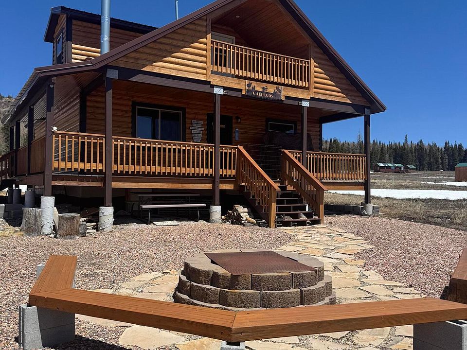 This beautifully built log cabin is located in the Rainbow Meadows Ranchos subdivision in Brian Head and features two bedrooms, a full kitchen, wood burning stove, and a full bathroom downstairs. The loft features a living area, sitting area, a half bath and a balcony with a gorgeous mountain view. There is a shed, space to park your RV and a wrap around patio to enjoy the wide open beauty of the area, star gazing and fishing nearby. The water storage tank and furniture are included. The water comes from a community well at a very reasonable yearly cost. Septic is installed.