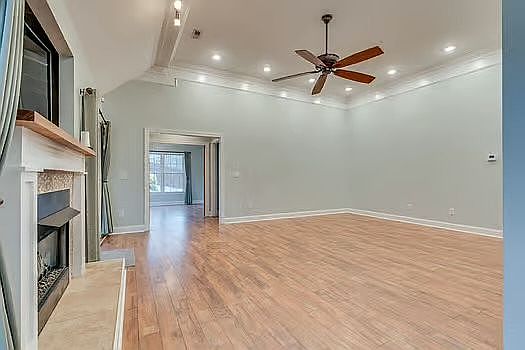 The spacious living area is perfect for entertaining or relaxing with family around the gas fireplace with a raised