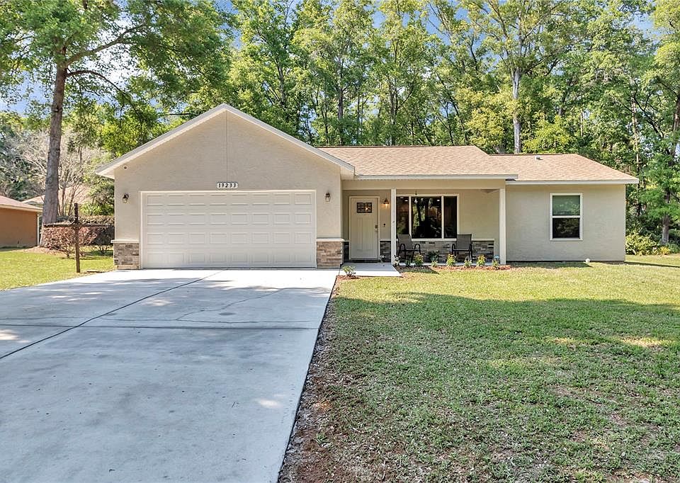 Welcome to this stunning 2019 built home, nestled on quarter of an acre of serene beauty. Boasting a spacious 3 bedroom 2 bathroom layout, this residence features a thoughtfully designed open floor plan with vaulted ceilings, creating an airy and inviting atmosphere. The kitchen has granite countertops, solid wood cabinets and stainless steel appliances which are surely to please anyone who loves cooking! Enjoy the luxurious touch of vinyl plank flooring that graces every corner of this home. The well planned split floor plan ensures privacy, while the covered front porch and rear patio provide ideal spaces for relaxing in the evenings and enjoying your favorite drink. With a two car garage you have plenty of room for your vehicle or a workshop. Home also comes with a transferable termite bond warranty! This low HOA community of $230/year has incredible amenities which include a community pool, fitness center, restaurant and private access for its members to The Rainbow River. Within 5 minutes of Dunnellon where you will find shopping, medical offices, grocery stores and more. A 30 minute drive to Ocala where you will find many options for shopping, dining, malls and hospitals.