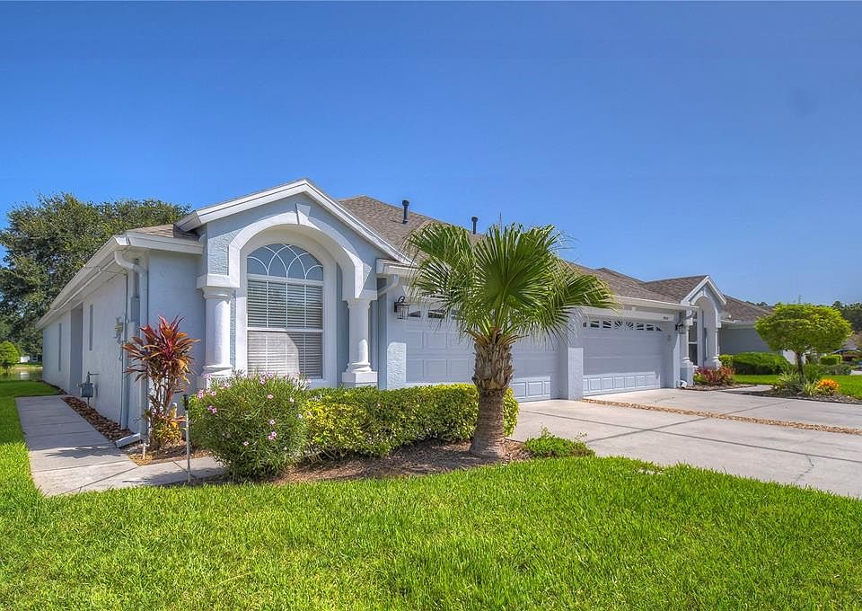 Welcome Home to your move in ready true 3 bedroom, two bath, two car garage Villa in the sought after gated community of Tanglewylde in the Oakstead Subdivision! This beautiful home is located on a stunning premium lot with amazing, serene pond views, from your back screened in porch and your private master bedroom retreat. Have peace of mind with your new roof installed 2022, and exterior painting done in 2023! There is a side entry with a lovely foyer as you enter the home, which is open, light, and airy. The two secondary bedrooms that share a bathroom with a tub are on one side of this home as you enter, and the master bedroom with its lovely en-suite bathroom, double sinks, stand up shower, walk in closet and views of the pond are in the back of this lovely Villa. The kitchen has granite counter tops, wood cabinets, lots of prep space, ample storage and pantry, and the washer and dryer conveniently located in a kitchen closet. Bring your groceries directly into your kitchen from your two car garage. The community fees cover the exterior paint, roof, lawn care and irrigation system and reserves. Great location and a few minutes away from Suncoast Expressway, Outlet Malls, recreation, restaurants, and fabulous schools! Villas with water views are in high demand, don't miss this one.