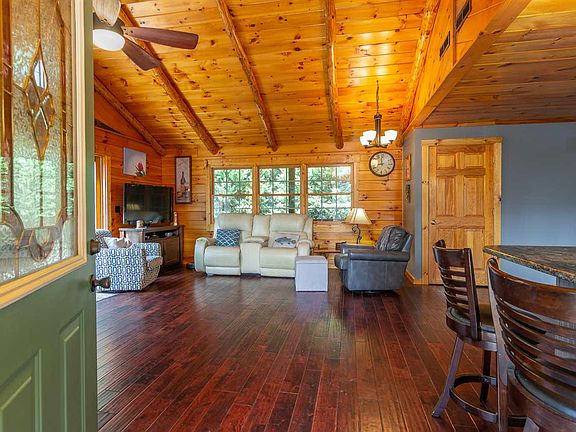 This is a great little piece of heaven on earth! Cute but solid, well-maintained D-log rancher is all you need, and it's wonderfully done! Granite counters, solid pecan hardwood flooring (not engineered) throughout main level, exterior stained Sept. 2020, new deck 2018, both bathrooms updated! (master bath has door-less walk in shower) New metal roof less than one year old, large shed added 2013, hot water heater 2013. Solid six panel pine doors throughout. Satellite dish removed and fiber optics cable added. Covered deck in front and rear; open deck on one side of home. Full, unfinished basement has finish potential for additional room plus great storage and two car garage. CHELAQUE has 40 covered boat slips at marina, boat ramp, common picnic area with pavilion, plenty of wildlife and peace and quiet. IF you have a boat slip (first come first serve basis) Marina annual fee is $600. Currently seller estimates there are about 15 boat slips available. HOA annual dues $550 cover common areas, pavilion, security cameras at gate, gate, roads and all signs maintenance. Private trash pickup optional for $25/month or free area dumpster.