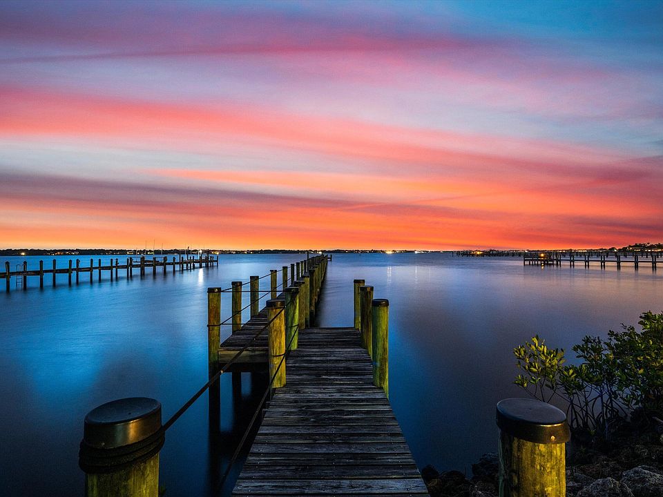 Set on an expansive double riverfront lot, this extraordinary residence boasts over 200 feet of protected shoreline, ensuring privacy, tranquility, and an intimate connection to nature. With unobstructed, sweeping views of the St. Lucie River, the home serves as a front-row seat to the spectacular beauty of panoramic sunsets that transform the sky into a canvas of vibrant colors each evening. This 7,500 sq ft modern masterpiece is a harmonious blend of cutting-edge design and the serene allure of waterfront living. Its striking architecture and floor-to-ceiling windows frame the river from nearly every angle. The residence radiates contemporary elegance while remaining firmly rooted in the natural beauty of its surroundings. Designed with seamless flow connecting to the outdoors, stunning residence boasts five spacious bedrooms and five and a half bathrooms, along with two officeseach offering serene views of the pool or water. A private guest suite adds an extra layer of comfort and privacy, creating the perfect retreat for family and friends. The property also features a 360-foot private dock, extending gracefully into the river, ideal for boating and just minutes away from the St Lucie Inlet and Atlantic Ocean.