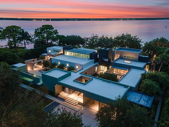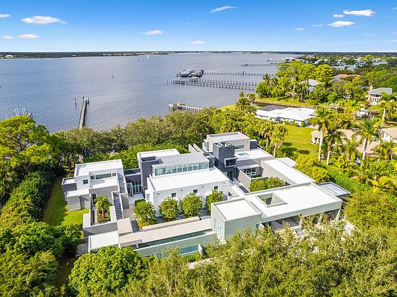 Set on an expansive double riverfront lot, this extraordinary residence boasts over 200 feet of protected shoreline, ensuring privacy, tranquility, and an intimate connection to nature. With unobstructed, sweeping views of the St. Lucie River, the home serves as a front-row seat to the spectacular beauty of panoramic sunsets that transform the sky into a canvas of vibrant colors each evening. This 7,500 sq ft modern masterpiece is a harmonious blend of cutting-edge design and the serene allure of waterfront living. Its striking architecture and floor-to-ceiling windows frame the river from nearly every angle. The residence radiates contemporary elegance while remaining firmly rooted in the natural beauty of its surroundings.