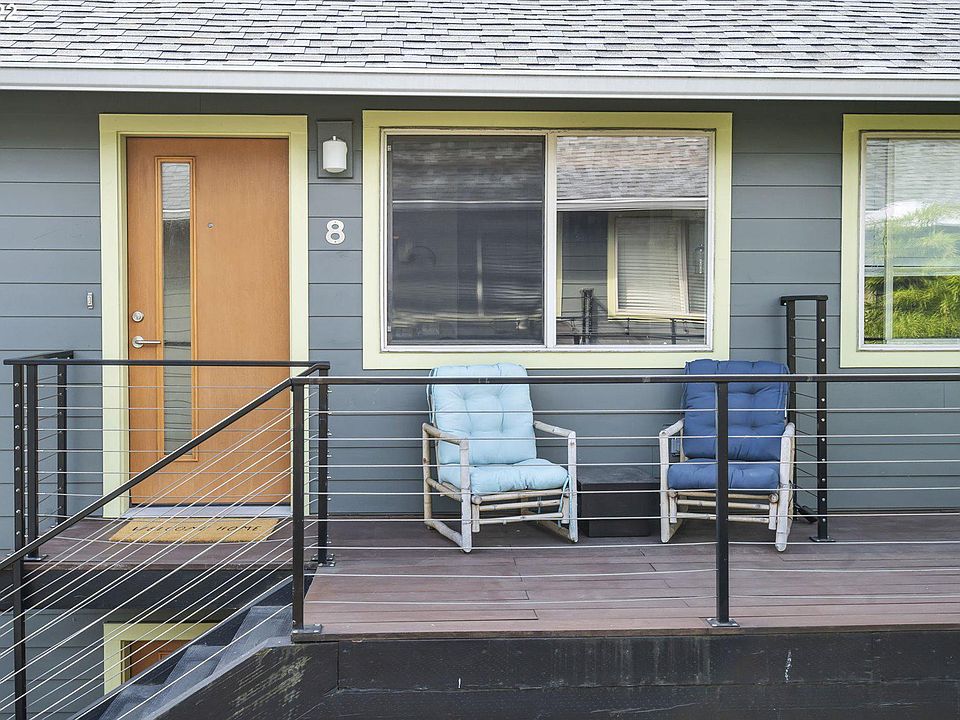 This light and bright two bedroom condo exudes a modern aesthetic with an industrial flair. The kitchen features cherry cabinets, granite counters and stainless appliances. An end unit far back from the street, it is fully equipped with air conditioning, laundry closet and Bali wood blinds for letting in light yet remaining private. One deeded parking spot plus a storage shed for your bikes, camping gear, tools and more!