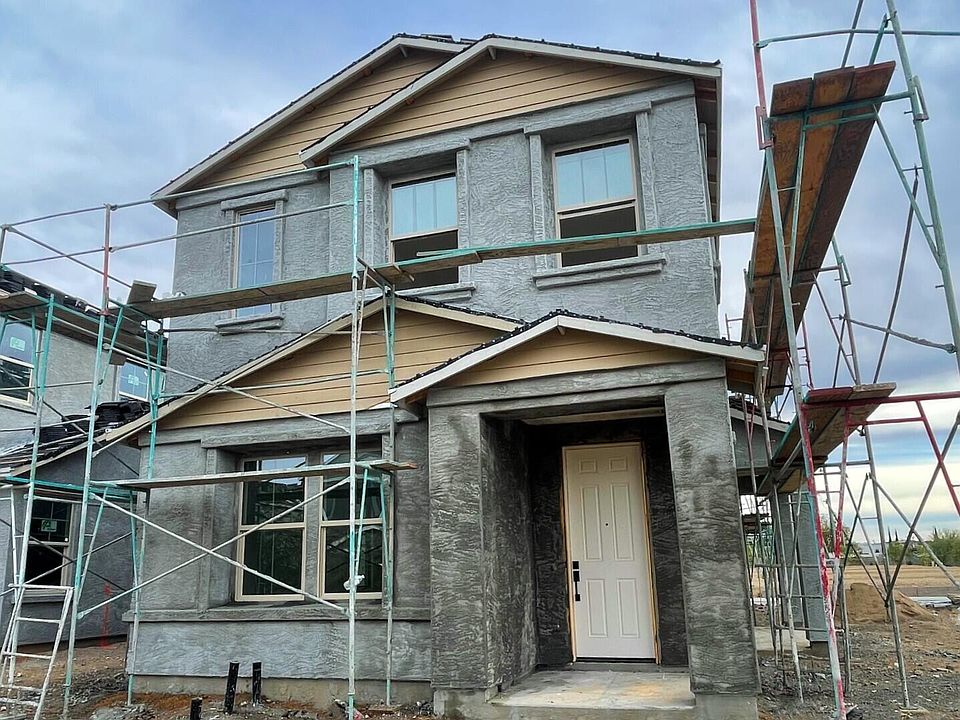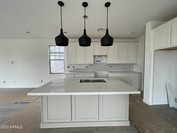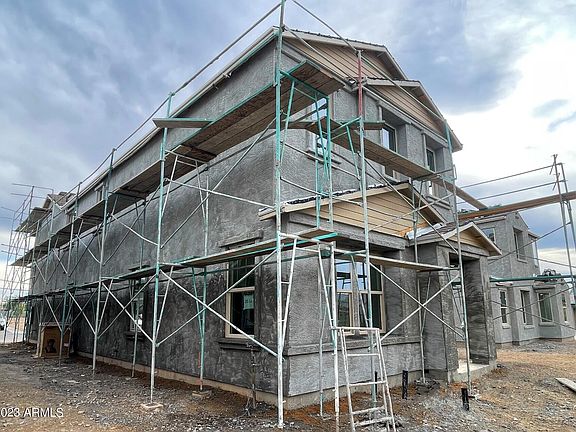 Tree-lined streets, pedestrian-friendly sidewalks and a 5,500 sf recreation center with resort style pool an kiddie pool, shaded ramadas, parks, gathering areas, pickelball courts and basketball. Close to I-10, 101 and 303. Walking distance to restaurants, movies, entertainment and shopping. 4-Panel sliding glass door from great room to covered patio. 4' gate at front and rear of side yard. Front yard landscaping to include turf. Gas stub for BBQ in side yard. Pavered entrywalk. Modified master bath, includes cultured marble surround and clear glass enclosure. Stainless steel whirlpool appliances, including dishwasher, gas range, and microwave. Shaker style cabinets painted white and silver gray with many extras including upgraded crown molding and boxed in refrigerator.