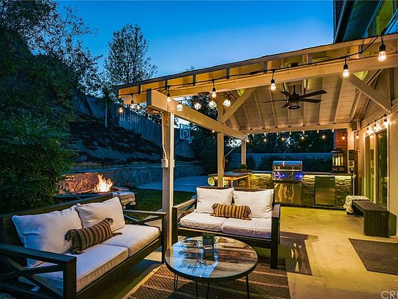 Nestled in the hillside, this 5 bed/3 bath home is located in the highly desired Castlebay Lane Charter Elementary & Granada Hills Charter HS District. Every attention to detail has been imagined here w/modern designer colors & finishes. Step outside to the outdoor living area, pull up a chair by the fire pit, watch your favorite show on the outdoor TV or craft the perfect burger at your custom kitchen/BBQ area under a covered patio w/twinkling lights. Challenge your friends to a rousing game of basketball on the SPORTS COURT or unwind to the soothing sounds of the cascading waterfall in your saltwater pool & spa with a shallow-water lounging area. The well-appointed kitchen w/newer Kitchen Aid stainless appliances & built-in icemaker provides great flow w/a wrap-around bench breakfast nook as well as an eat-at peninsula so the cook is never left out of the conversation. Upstairs, the bedrooms have abundant storage w/custom built-in closets & drawers allowing for valuable floor space. Upgrades include a newer roof and fully paid-for SOLAR PANELS, a 240-volt car charger, triple pane windows & sliders, tankless water heater & dual-zoned AC/heat to keep your energy bills down. The main sewer line, w/2 easy to reach cleanouts. was replaced in the last year as well as a freshly painted exterior, helping to keep maintenance costs down. Conveniently located near parks, schools, hiking trails, and shopping. Don't miss this opportunity to make it yours.