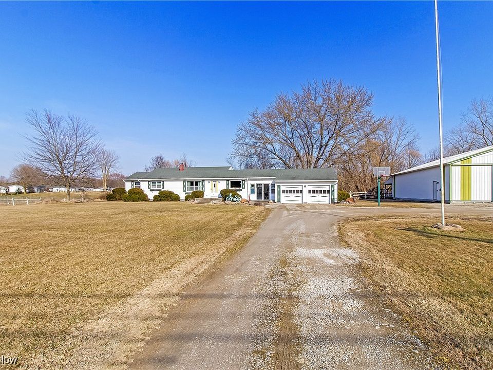 Looking for a little room to roam? Room for all your toys? This house is out in the country but just a short drive to all the city amenities. Cute ranch situation on almost 2 acres. Either natural hardwood or updated LVP on the main level. Concrete countertops and white cabinets in the kitchen. Wall oven, cook top and refrigerator stay. 3 Bedrooms. Updated bathroom. Full basement. Mostly finished. Windows, Doors, and Roof all redone. Septic System and Boiler are about 12 years old. Concrete in out- building, patio and walkway redone. Fenced in backyard is a peaceful retreat. Covered patio area. Outbuilding is a 70' x 78' pole barn. Large unheated section. Smaller heated section with attached workshop. The house is zoned residential and the outbuilding is zoned commercial. So it would be very easy to run a business out of it.