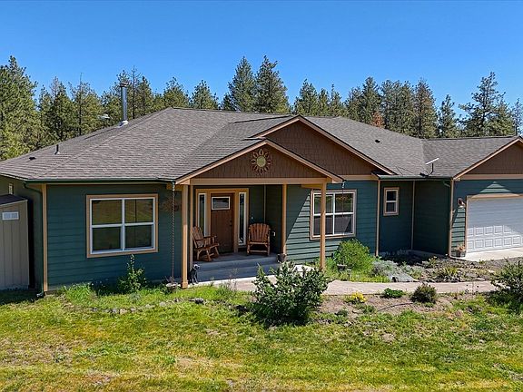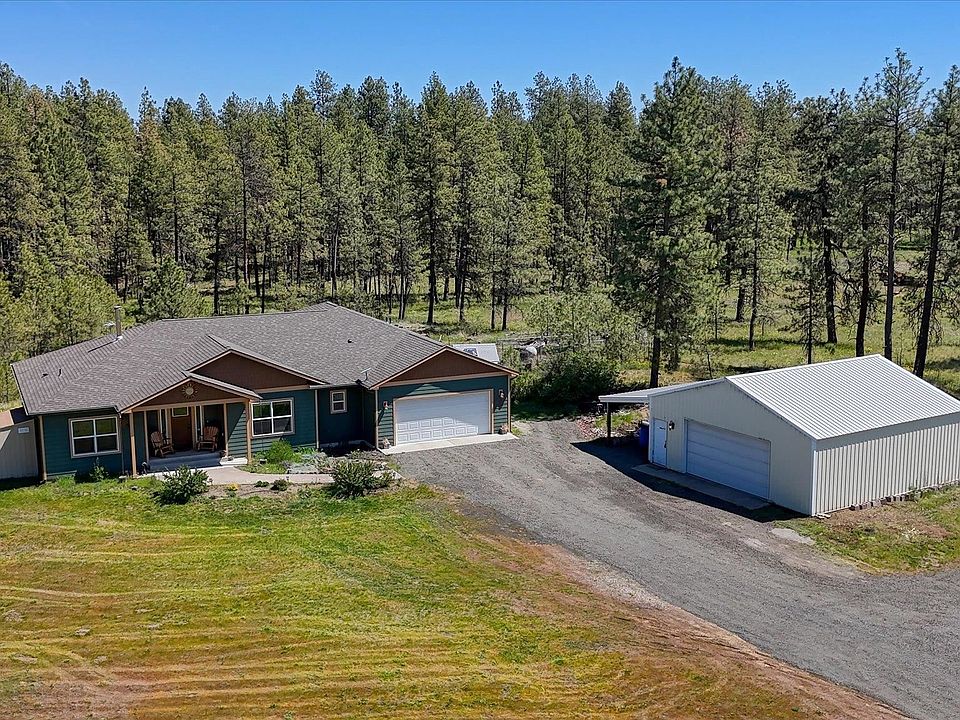 This 1 level home is a very popular design, and sits on 6.5 acres! Built in 2018 with recent updates, this rancher has 3 bedrooms with a den/office or 4th bedroom. The open concept of the living room has 12' ceilings and a cozy wood fireplace. The kitchen has an eating bar, custom cabinets, granite countertops and SS appliances. The formal dining room is huge and many windows to enjoy the view! The master suite is oversized with a walk in closet, double sinks and a separate tub/shower combo. Enjoy the morning sun on the covered patio with a great cup of coffee. An oversized 2 car attached garage and a 30x30 shop will hold all of your toys! The shop also has a pellet stove to heat it up on those colder days. Enjoy country living with close proximity to Cheney and Spokane.