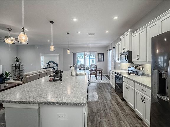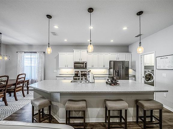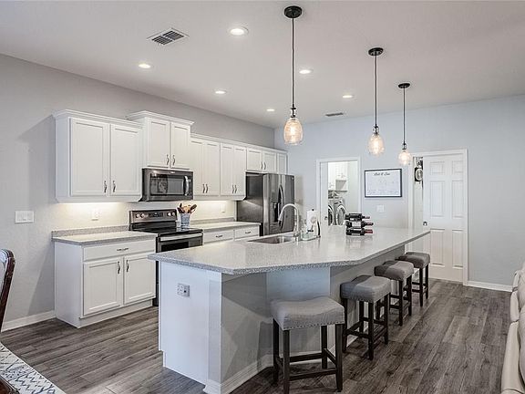 Welcome to this stunning Highland Homes Shelby floor plan home located in the desirable Donovan Trace community of North Lakeland. Built in 2018, this well-maintained home offers 2,021 sq.ft. of living space (2,743 sq.ft. total under roof) with an inviting open floor plan, 4 bedrooms, and 2.5 baths. The gourmet kitchen is the centerpiece of the home, featuring a granite/quartz island, stainless steel appliances, brightly lite with pendant lighting and many canned lights. Top this off with an extra-large pantry custom-designed by California Closets—complete with wine storage, shelving, and drawers. Enjoy casual dining in the eat-in nook with sliders leading to the lanai and backyard views. The primary suite is spacious and elegant, boasting built-ins and a California Closets custom walk-in closet. Ensuite has a relaxing garden tub, separate shower, and comfort-height toilet. Two guest bedrooms share a convenient Jack and Jill bath, while the fourth bedroom—with its built-in closet—makes an excellent home office. Additional features include a galley laundry room with cabinetry and counter space, a 2-car garage with built-in storage (an extra 4 feet added for additional room), and thoughtful upgrades throughout. Step outside the 15'x15' tiled lanai to your private, fenced backyard with a 6-foot PVC fence, paver patio, cobblestone wall accents, and a raised garden bed—perfect for flowers or vegetables. A storage shed conveys with the sale, and the owners have added a French drain system directing rainwater efficiently to the culvert—an upgrade that sets this property apart. With beautiful curb appeal, quality upgrades, and a convenient location close to shopping, dining, medical facilities, and just an hour from Disney, this home offers both style and practicality. Easy access to I-4 makes commuting to Tampa or Orlando a breeze. Move-in ready and full of thoughtful touches—this North Lakeland gem is one you won’t want to miss!