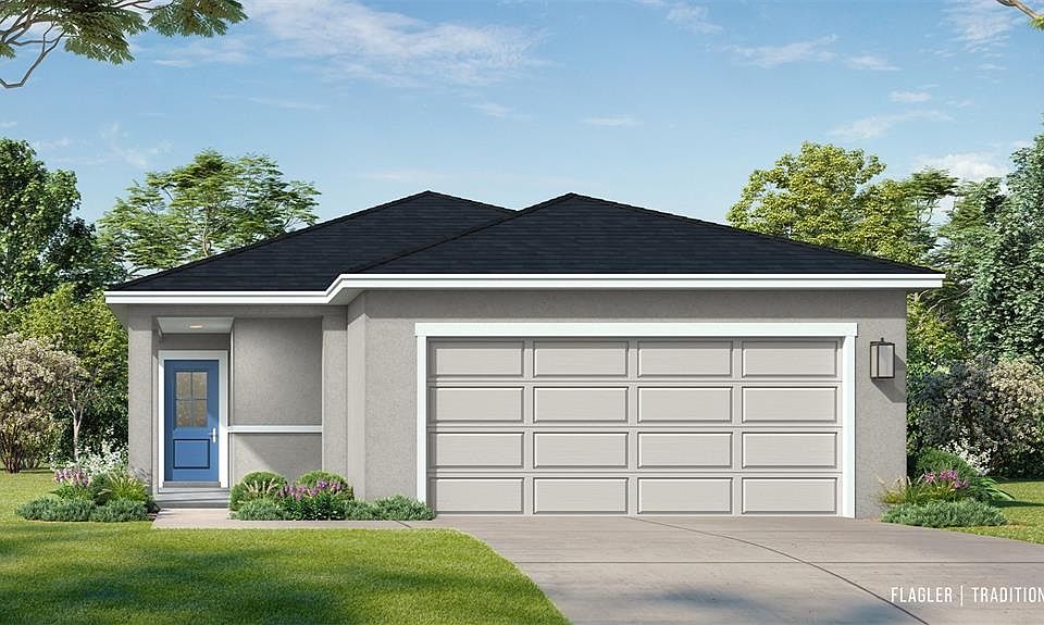 Under Construction. Beautiful Single Level, 2 Car Garage Home with Open Concept Living and 3 Bedrooms! The Flagler plan is in the Traditional exterior design. The covered porch opens to a gracious foyer with adjacent flex space and leads to the open island kitchen with espresso cabinets and granite countertops, cafe and family room. The private garage opens to a hallway with 2 secondary bedrooms and full bathroom with dual sink vanity. The primary suite boasts a large walk-in closet and ensuite bathroom that includes a shower and private water closet
