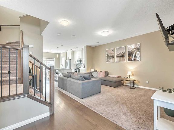 Welcome to this stylish semi-attached duplex in the family-friendly community of Bayside, Airdrie. This home offers 3 bedrooms and 3.5 bathrooms, including a primary suite with walk-in closet and private ensuite, plus 2 additional bedrooms and a full bath on the upper level. The main floor features hardwood throughout, a bright living room, dining nook, and a modern kitchen with quartz countertops, stainless-steel appliances, a central island, and pantry—perfect for everyday living and entertaining. The fully developed basement includes a den, a huge recreation space and another full bathroom plus a laundry room. Outside, enjoy a private fenced backyard with a deck and low-maintenance landscaping, as well as a welcoming front yard. A single attached garage with parking for two more vehicles on the driveway adds convenience. Ideally located near parks, schools, and amenities, this Bayview property is a must-see!