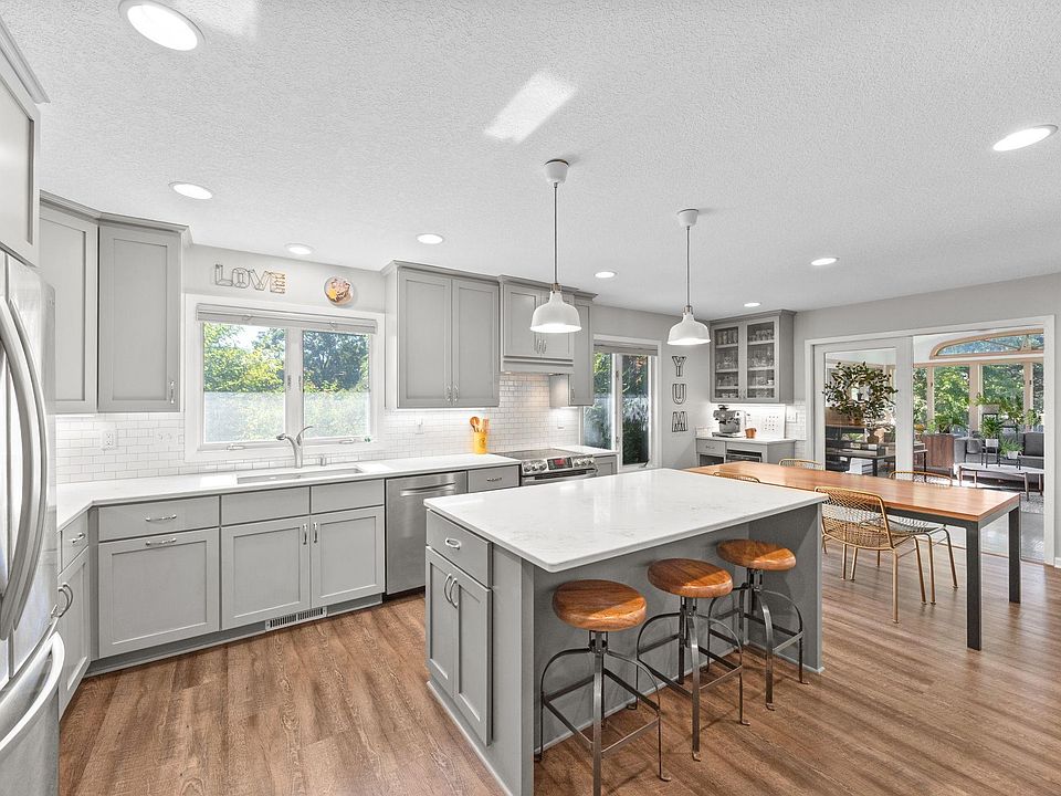 Modernized fireplace surroundLarge center islandNew acSpacious west-facing deckLvp flooringPrivate outdoor retreatOpen-concept living space