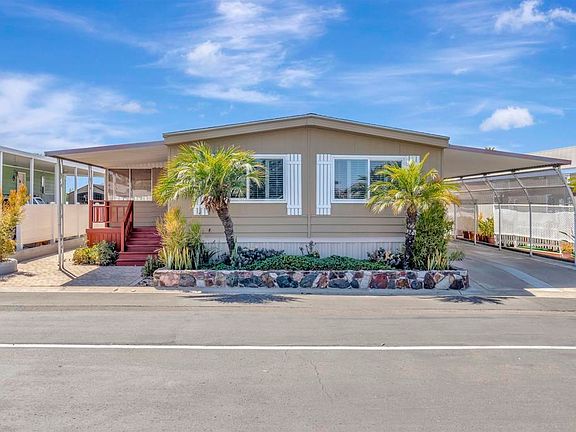 Very nice Mobil Home! Well maintained. New Carpet and Paint. Washer and Dryer to stay. Great location! Accross the street from the pool and Clubhouse. 2 sheds stay. Park 2 cars in the carport. Drought tollerant plants in front planter. Large Sunroom off the kitchen.