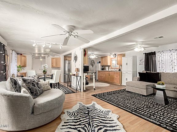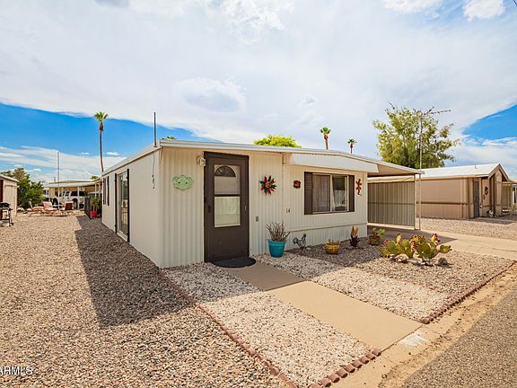 Charming manufactured home in Hohokam! This 2 bed + den, 1.5 bath home offers carport parking, a workshop, and in-unit laundry. Inside features wood-look flooring, abundant natural light, neutral tones, and sliding doors to the patio. The kitchen is well-appointed with ample cabinetry, tile counters & backsplash, and built-in appliances. The main bedroom includes a closet and private bath. Enjoy the cozy covered patio for morning coffee or quiet evenings. Located in a welcoming adult community with pool and clubhouse access. Don't miss this one!
