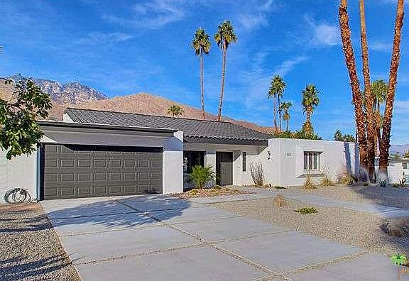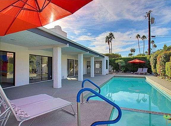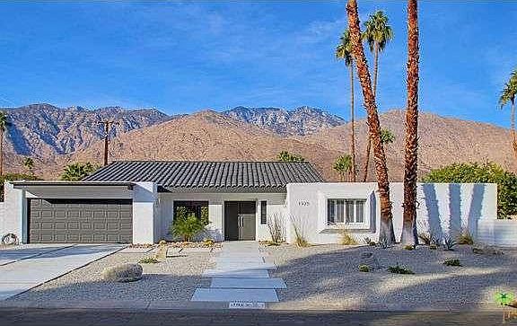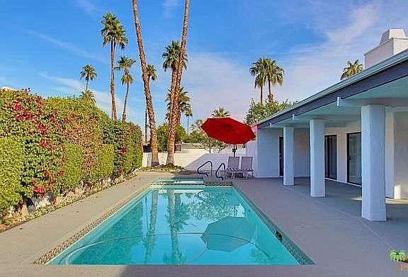 Premised on a recent email from Hugh Kaptur, the architecture is believed to be by Hugh Kaptur and Larry Lapham who worked in partnership between 1965 & 1975. Exceptional renovation, interior and exterior. 3 bedroom, 2-1/2 bath Twin Palms home on a corner lot. Double door entry leads you into an expansive great room with vaulted cathedral beamed ceilings, clerestory windows, fireplace, sunken wet bar and open concept island kitchen for entertaining. Sliding glass doors from living room, Dining area & kitchen transition to your private backyard enhanced by a large covered patio pool, spa, and open yard space. West facing mountain views and low maintenance desert landscape. Spacious mastersuite with dual closets and an amazing master bathroom with separate soaking tub & walk-in shower. Two spacious guest room, new carpet and tile throughout. Double car attached garage and new front concrete hardscape. No land lease, you own the land.