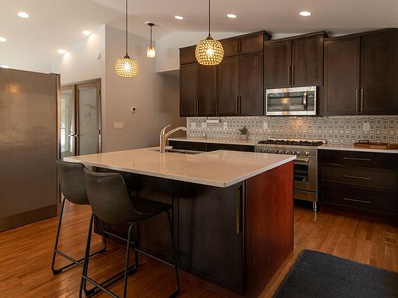 Home features main floor laundry, recent new kitchen with quartz counters & barstool island. All 3 bathrooms updated, featuring new tile, shower doors. Hardwood floor throughout main level, all newer appliances in home on-demand water heater, water softener, furnace 2019 with whole house humidifier, air conditioner, stainless steel, microwave, commercial size refrigerator, dishwasher & commercial gas stove. Home well insulated with energy saving features. Basement has full lookout windows, updated bedroom & bathroom