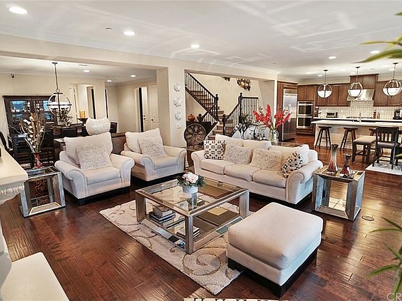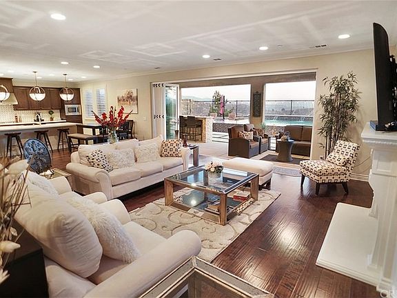 Stunning 5 bed, 5 bath POOL/VIEW Canyon Crest Home. Better than NEW because it's DONE! Breathtaking PANORAMIC VIEWS, 4307 sqft, 5 years young, turnkey & extensively upgraded, tasteful landscaping, Exquisite Infinity Edge Saltwater Pool/Spa, Bonus Room (possible 6th bdrm), Loft, NO MELLO ROOS, PAID SOLAR. Upon entering the formal foyer it's clear that no expense was spared creating this serene home that encompasses the epitome of CA living. The interior flows beautifully through an open concept 1st floor with high ceilings & appointed with finer finishes such as elegant flooring, quality built-ins & crown molding. Offers a formal dining room, a great room with fireplace which opens to a gourmet kitchen with top quality built-in appliances, large center island, Silestone counters, butler's & walk-in pantry. Pass through the accordion sliding glass wall to a great outdoor living room with fireplace & outdoor kitchen. Full downstairs guest suite, add'l powder room & bonus room (gym) downstairs. Upstairs has a generous loft/media room, 4 BD, 2 BA, laundry room & the primary suite which showcases a large view deck. The connecting spa bath offers dual sided walk-in closets, dual vanities, a soaker tub & separate oversized shower. Other features include: Silestone counters throughout, custom tile & stone, plantation shutters, recessed lighting, many energy-efficient features, 2 car garage w/ epoxy floor. LOW HOA dues! There's WAY too many features to list in this sophisticated home!