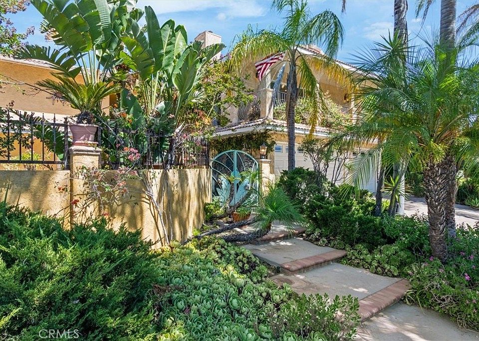 This Mediterranean-style home, with its distinctive Mid-Century Modern flair, presents a rare opportunity for a buyer with vision. Situated on a desirable corner lot within a highly sought-after top-tier school district, the property features a private, gated entry. Inside, soaring ceilings, an elegant MCM staircase, and an impressive floor-to-ceiling fireplace are complemented by expansive windows that fill the sunken living and dining areas with natural light. The main level offers a flexible bedroom and a full bath, alongside a spacious den that could function as a sixth bedroom or combine to create a private mother-in-law suite or attached rental apartment. Stone flooring in the living and dining rooms leads to a covered patio and a lush, tropical-style garden featuring a Koi pond, lap pool, and two covered patios. An eat-in kitchen with sliding doors opens to a second covered patio with stone tile and a unique aviary. A three-car garage provides ample storage. The second floor features an extra-large primary bedroom with a huge private balcony, fireplace, and two closets, including a walk-in, plus a massive en-suite bath. Three additional generously sized bedrooms, two with their own balconies, and extensive storage complete the upstairs. This home is a canvas awaiting your creative vision.