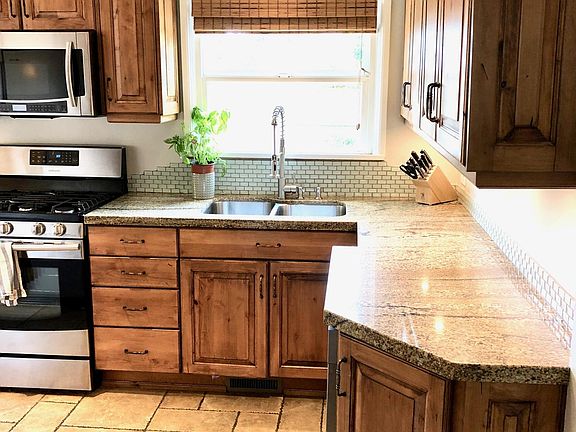 -Remodeled kitchen with granite countertops, stainless steel appliances, glass tile backsplash, and mountain views from the sink.