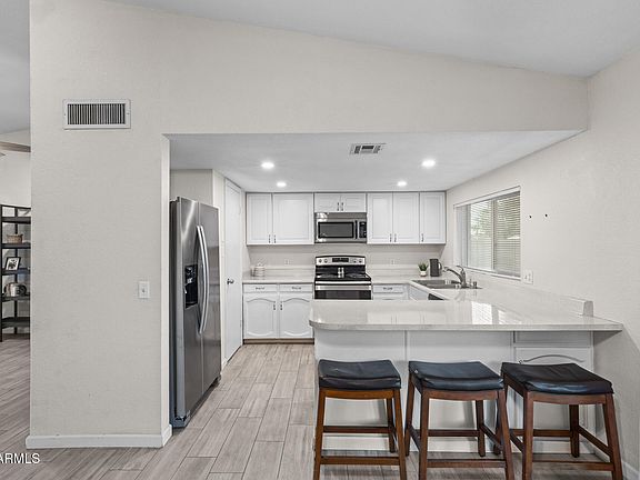 The kitchen features sleek upper cabinets, stainless steel appliances, and a modern design that opens seamlessly to the dining and living spaces. Both bathrooms have been stylishly updated including a freshly renovated primary shower in 2025.